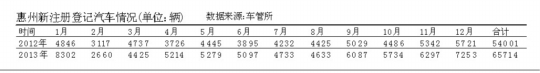 全国车市行情比预期好,惠州这样的二三线城市也水涨船高。惠州车管所统计数据显示,2013年新注册登记汽车为65714辆,与2012年的54001辆相比,同比增长22%。南都记者也注意到,去年1-10月惠州新注册登记汽车为52164辆,同比去年42938辆,增长了21.5%,这就为2013年新车增长两成定下了基调。